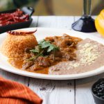 Slices of steak cooked with onions covered with red hot salsa. Served with tortillas, rice, and beans.