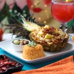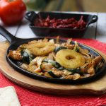 Steak or chicken, bacon, ham, poblano peppers, and pineapple. Served with rice, beans or charro beans, lettuce, guacamole, sour cream, and tortillas.