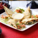 Birria style-meat and melted cheese tacos topped with cilantro and onions. Served with rice and consomé dip.